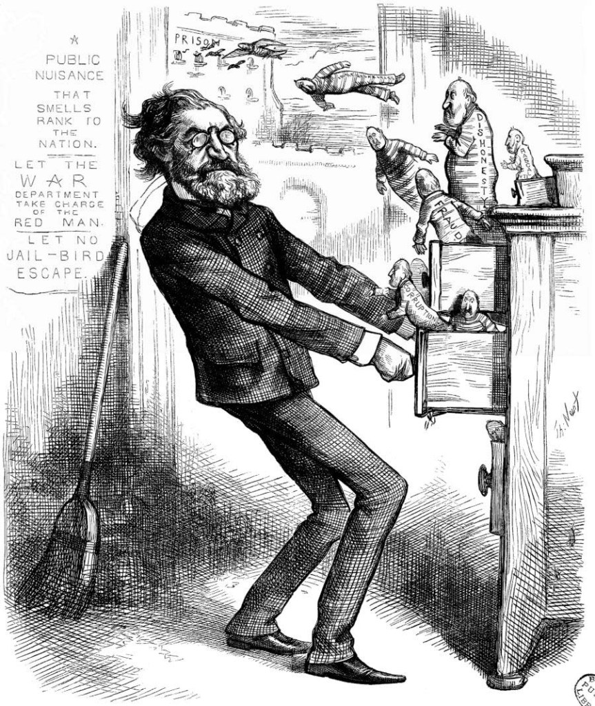 And, last but not least, there were more scandals. Grant’s second term began with what became known as the “Salary Grab.” Grant and Congress increased the salaries for each of the three branches of government. It was not unwarranted. President Grant’s salary, for instance, was the same as George Washington’s. The real controversy, though, was that it also included retroactive payment for the previous years of each official’s term. This meant that congressmen were earning thousands of dollars for years already paid. Obviously, that did not sit well with the American public. In keeping with expectations, almost every level of Grant’s administration was involved in a scandal. Honestly, there were too many to describe them all. The Departments of Treasury, Interior, War, Navy, and Justice were all engaged in complex rings of bribes and/or extortion. One of the most famous scandals was the Whiskey Ring, wherein government officials took bribes to help distillers evade the high whiskey taxes. Rescinding his position of peace with Native Americans, Grant also allowed miners to break the Treaty of Fort Laramie when gold was discovered in the Black Hills of Great Sioux Reservation.