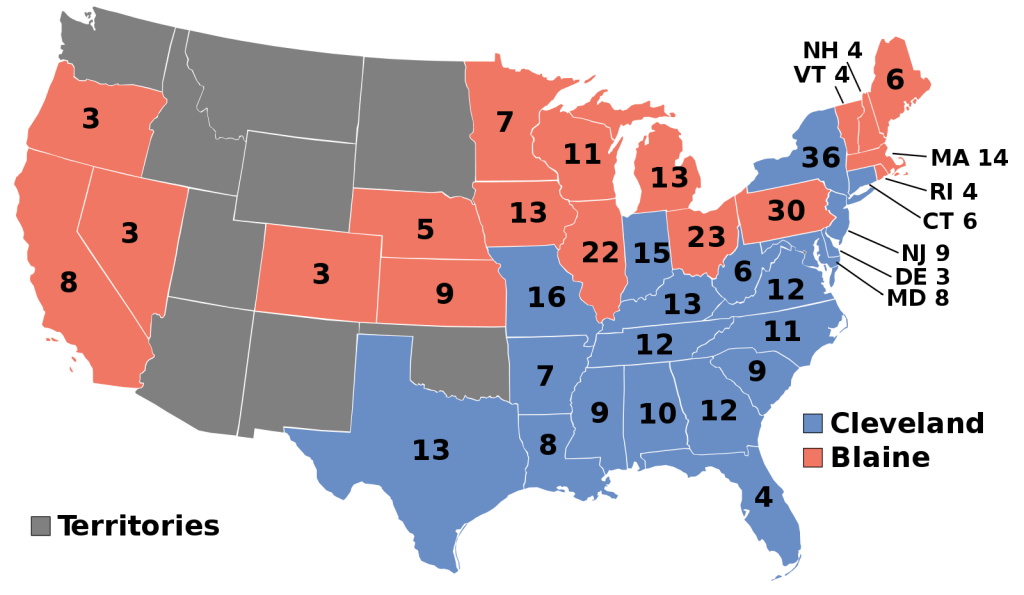 As expected, the results in New York were extremely close. Cleveland won his home state by just over 1,000 votes. Democrats, still angry about the Compromise of 1877, quickly organized a legal team to prove that the win was legitimate. Cleveland also benefited from the Solid South and key swing state wins like Indiana.