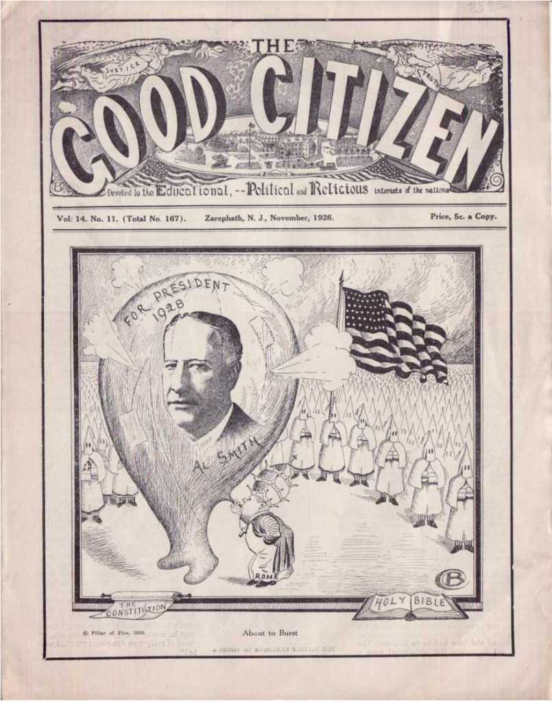 In addition to Republicans’ good economy, Smith faced three major challenges in his campaign: his religion, his connection to Tammany Hall, and his opposition to Prohibition. Reaction to Smith’s Catholicism was extremely bigoted. Though he made it clear that he believed in the separation of church and state, many thought that a Catholic president would take orders from the Pope. The most paranoid citizens feared that Smith would annul Protestant marriages and declare their children bastards. They even claimed that he planned to extend the Holland Tunnel all the way to the Vatican. Protestant preachers spoke out against Smith to their congregations. On a campaign stop in Oklahoma, the candidate faced burning crosses from the KKK along the route to his speech. Smith’s connection to Tammany Hall also hurt him in rural areas. While every major city had a political machine of their own, Tammany was regarded as the definitive symbol of corruption. Finally, Smith’s preference to leave Prohibition up to the states drew hate from temperance organizations. His connection to alcohol led to rumors of him being drunk in public and tied him to other vices, such as gambling. Some even called him “Al-coholic Smith.”