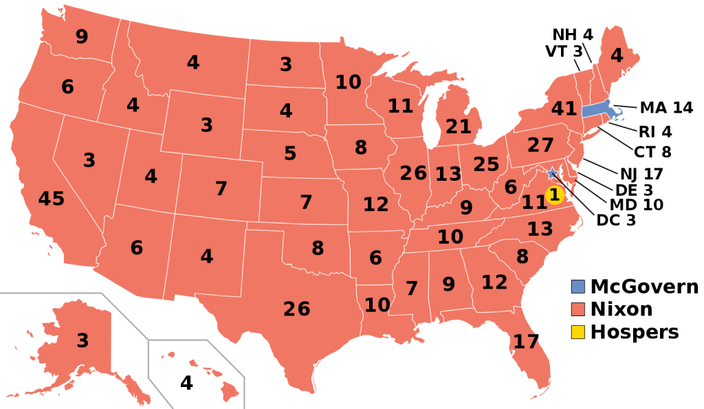 Without George Wallace, the segregationist American Independent Party struggled to remain relevant. They selected California Representative John Schmitz as their nominee. New to the process was the Libertarian Party! They ran John Hospers, a political activist and friend of Ayn Rand. He was only officially on the ballot in Colorado and Washington.