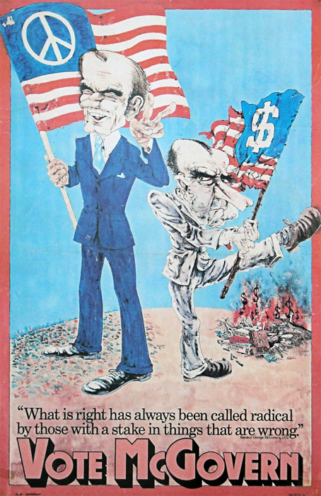 All of this uncertainty left the Democratic nomination open for dark horse candidate George McGovern. In addition to lending his name to the commission that made his candidacy possible, McGovern was a WWII veteran and served as a minor official in the Kennedy Administration. His main issue was Vietnam, and he made it clear that his first action would be to bring the troops home. He quickly became the spokesman of the anti-war and social justice movements. McGovern intentionally used the new primary rules to mobilize his young, anti-war base in hopes that the momentum would persuade party regulars to back him, too. Establishment Democrats resisted his pull. The threat of “amnesty, abortion, and acid” became a rallying cry of the stop-McGovern movement. But McGovern won enough states to secure the nomination on the first ballot of the convention. His supporters’ proposed platform continued to scare moderates. They called for immediate withdrawal of troops, amnesty for draft dodgers, busing to achieve racial integration in schools, abolishment of capital punishment, a ban on the sale of handguns, and a guaranteed minimum income. Most shocking of all, their platform declared, “Americans should be free to make their own choices of lifestyles and private habits without being subject to discrimination or prosecution.” The convention was full of young, radical activists. Television viewers got the impression that McGovern was the candidate of hippies, aggressive women, elitist college students, and militant blacks. In his acceptance speech, McGovern attempted to clarify that he was more moderate than he appeared. Unfortunately, the convention ran long and his speech was not delivered until 3:00AM, completely missing prime time.