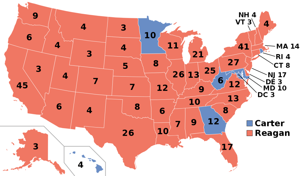 Polls predicted a Reagan victory, but not a blowout of this proportion. Carter only won six states and the District of Columbia, including his home state of Georgia and Mondale’s home state of Minnesota. Reagan made gains with traditionally Democratic constituencies like Catholics and working-class families. Even Carter’s Southern base switched back to the Republican ticket. Anderson won 6.6% of the popular vote, but no states. His most notable effect was taking votes from Carter in the Northeast