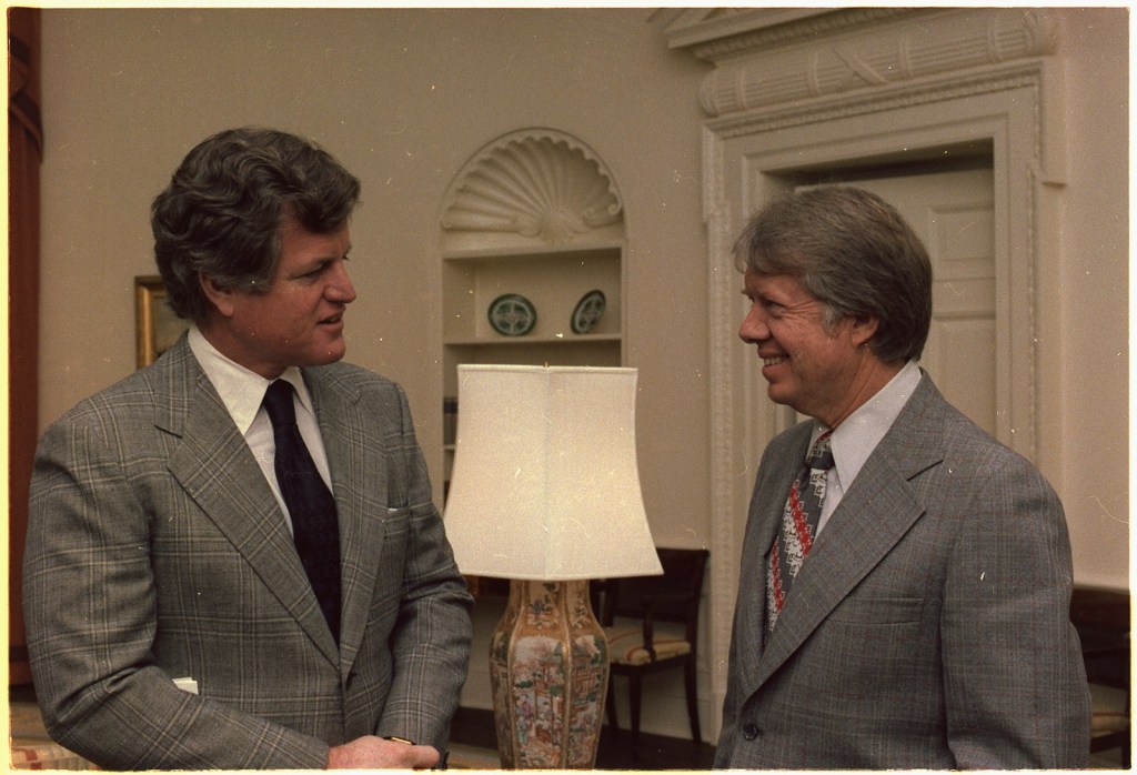 Due to his low approval rating, Carter was worried about losing his re-nomination. His concerns materialized when Massachusetts Senator Ted Kennedy announced his candidacy. Still relatively young, Kennedy brought a combination of excitement and nostalgia. He had been a favored primary candidate for several election cycles, but had never previously made it official. Carter’s response to his challenge was, “I’ll whip his ass.” Kennedy started ahead of the President in polls. His lead fell, however, as the Chappaquiddick controversy gained more media attention. Carter’s polls improved at the onset of the Iran Hostage Crisis, as voters initially felt the need to rally behind him. Kennedy campaigned hard in Iowa, but Carter won twice as many delegates. The President continued that momentum and was the clear winner of the primaries. As the hostage crisis dragged on, however, Democrats became more worried about Carter’s capabilities. The party convention was divided. Kennedy made one last pitch by calling for an “open” convention, wherein delegates would be released from their commitments to the primary results. His idea was voted down, and he subsequently withdrew. Carter and Vice President Walter Mondale were re-nominated on the first ballot.