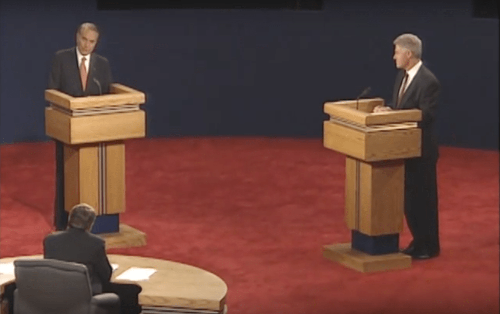 Unlike 1992, the Commission on Presidential Debates (made up of Republicans and Democrats) deliberately changed its rules to exclude Ross Perot. The third-party candidate’s already disappointing poll numbers were further damaged as it became obvious that he could not improve upon his last election result.