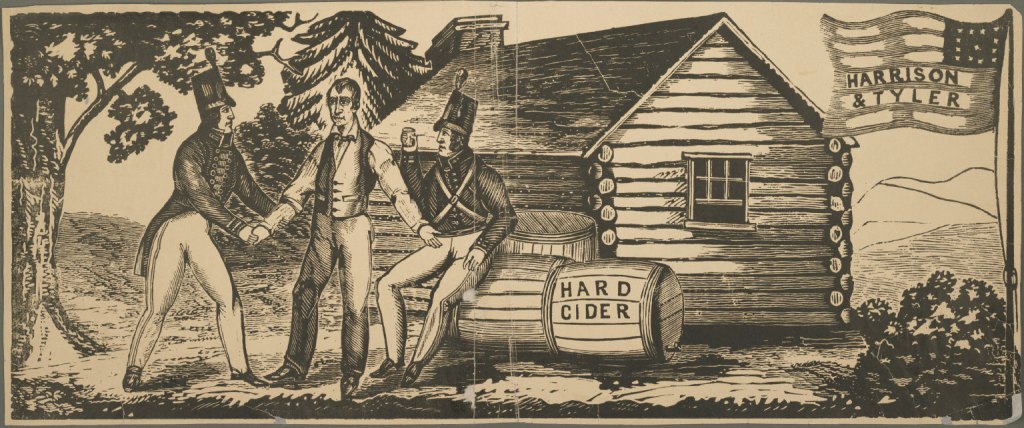 Clay encouraged his supporters to back Harrison, arguing that advancing Whig principles should be their true motivation. The 1840 campaign, however, was better known for its catchy slogans than its principles. Whigs finally flipped the narrative against the Democrats and captured the enthusiasm of voting public. Local Whig clubs held parades and rallies. Supporters rolled giant balls covered in campaign material through their streets. They sang songs and cheered slogans like, “Van, Van, Van, Van’s a used up man!” and “Harrison and prosperity or Van Buren and ruin.” The most prominent imagery of the Harrison campaign was gifted from the opposition. Following the nominating convention, a Democratic newspaper published a quote from a disheartened Clay supporter, who complained, “Give [Harrison] a barrel of hard cider, and settle a pension of two thousand a year on him, and my word for it, he will sit the remainder of his days in his log cabin.” While he intended to suggest that Harrison was better fit for retirement than the presidency, it instead gave Whigs a chance to portray him as the common man’s candidate. The label was not entirely accurate. Harrison came from a wealthy family, and never lived in a log cabin. Nevertheless, log cabins and hard cider quickly became symbols of his campaign. One batch of promotional alcohol became so popular that its creator, E. G. Booz, became synonymous with drinking forever.